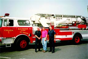 SPIFFY NEW LOOK: Pictured is Bayonne Fire Department's newly repaired and refinished '79 Mack fire truck No. 1. The color was changed from safety lime green to fire engine red by Valtek, Inc. From left are: Deputy Chief Thomas Lynch, Bayonne Fire Department; Brian Vesley, Valtek, Inc., Paterson; and Lt. Bill Bartos, Bayonne Fire Department.